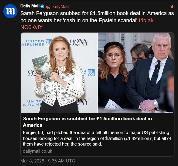 [027]Sarah Ferguson snubbed for £1.5million book deal in America as no one wants her 'cash in on the Epstein scandal' media link media link