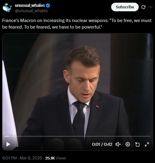 [085]Macron on increasing its nuclear weapons: "To be free, we must be feared. To be feared, we have to be powerful." media link