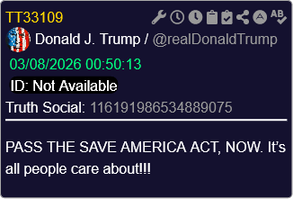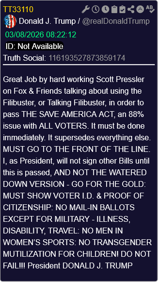 [016]@ScottPresler BREAKING President Trump said he won’t sign other bills until the SAVE America Act is passed media link