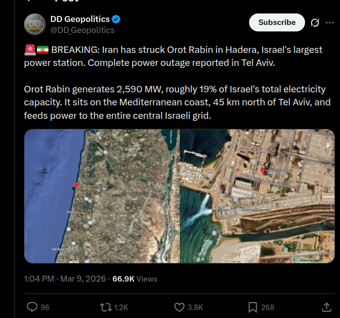 [121]BREAKING: Iran has struck Orot Rabin in Hadera, Israel's largest power station. Complete power outage reported in Tel Aviv media link