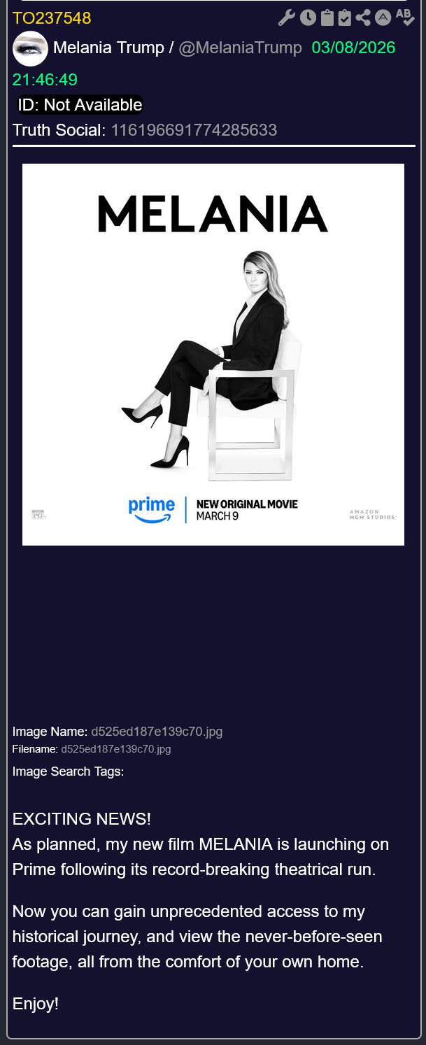 [105]EXCITING NEWS! Melania Trump: As planned, my new film MELANIA is launching on Prime following its record-breaking theatrical run media link media link