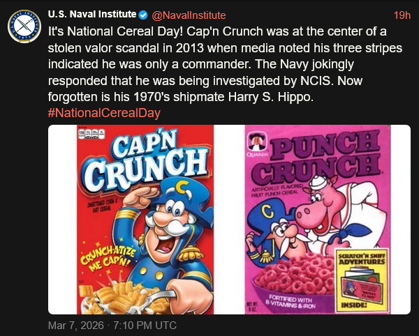 [020]@NavalInstitute - It's National Cereal Day! Cap'n Crunch was at the center of a stolen valor scandal in 2013... media link