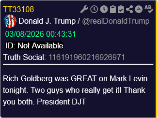 [011]@realDonaldTrump Rich Goldberg was GREAT on Mark Levin tonight. Two guys who really get it! Thank you both media link