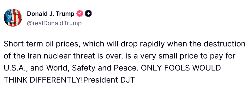 [084]@realDonaldTrump Short term oil prices, which will drop rapidly when the destruction of the Iran nuclear threat is over, is a very small price to pay for U.S.A., and World, Safety and Peace. ONLY FOOLS WOULD THINK DIFFERENTLY! media link