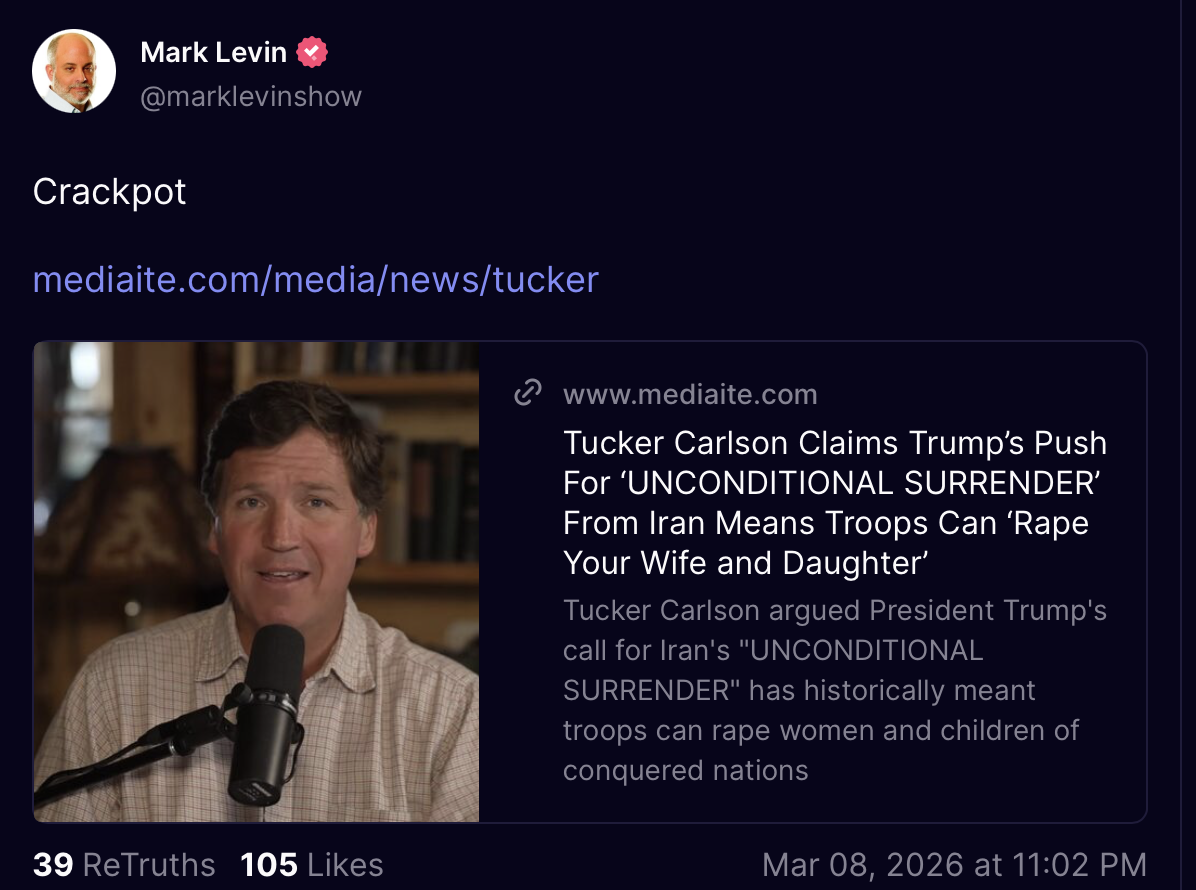 [119]Tucker Carlson Claims Trump’s Push For ‘UNCONDITIONAL SURRENDER’ From Iran Means Troops Can ‘Rape Your Wife and Daughter’ media link