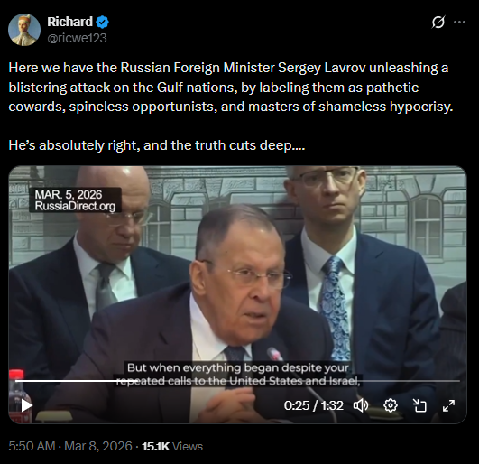 [077]Sergey Lavrov labels the Gulf nations as pathetic cowards, spineless opportunists, and masters of shameless hypocrisy media link media link media link