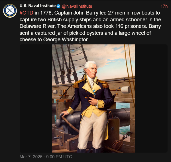 [021]@NavalInstitute #OTD in 1778, Captain John Barry led 27 men in row boats to capture two British supply ships and an armed schooner in the Delaware River media link