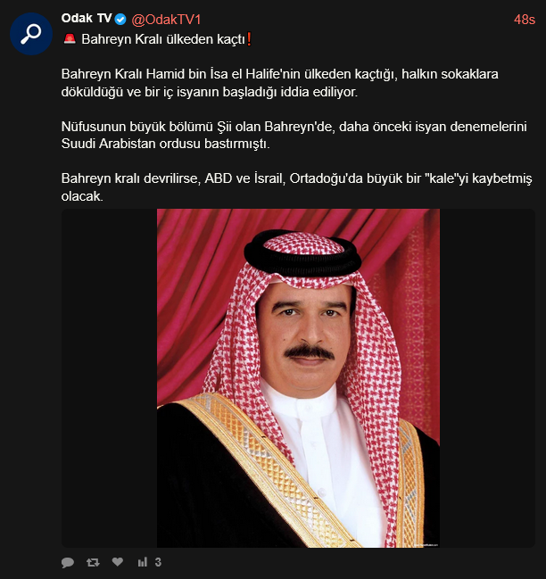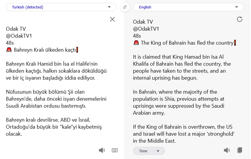 [096]It is claimed that King Hamad bin Isa Al Khalifa of Bahrain has fled the country, the people have taken to the streets, and an internal uprising has begun. In Bahrain, where the majority of the population is Shia media link media link media link
