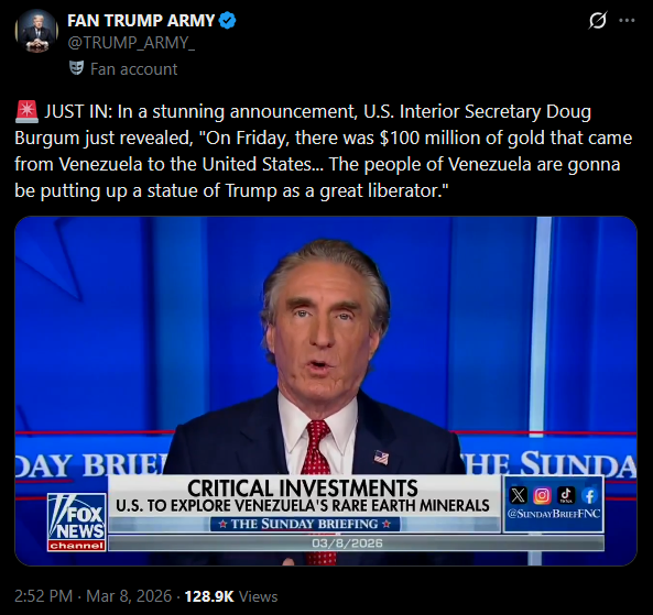 [079]U.S. Interior Secretary Doug Burgum says Venezuelans are going to be putting up a statue of Trump media link