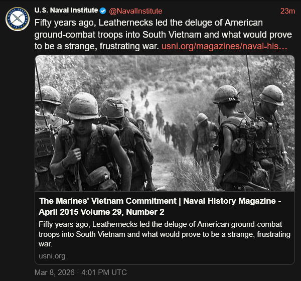 [043]@NavalInstitute Fifty years ago, Leathernecks led the deluge of American ground-combat troops into South Vietnam media link