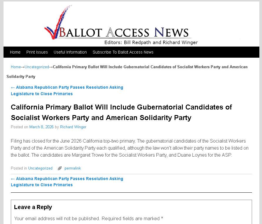 [071]California Primary Ballot Includes Gubernatorial Candidates of Socialist Workers Party and American Solidarity Party media link