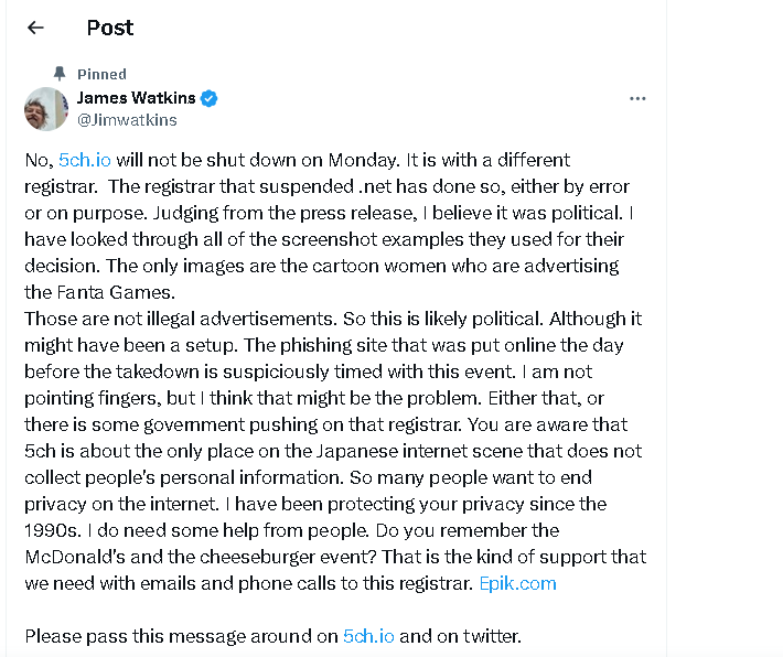 [060]NEW @Jimwatkins - No, http://5ch.io will not be shut down on Monday. It is with a different registrar media link