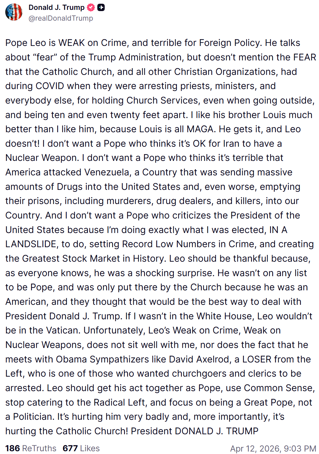 [059]@realDonaldTrump Pope Leo is WEAK on Crime, and terrible for Foreign Policy. He talks about “fear” of the Trump Administration, but doesn’t mention the FEAR that the Catholic Church, and all other Christian Organizations, had during COVID when they were arresting priests, ministers, and everybody else, for holding Church Services, even when going outside, and being ten and even twenty feet apart. I like his brother Louis much better than I like him, because Louis is all MAGA. He gets it, and Leo doesn’t! I don’t want a Pope who thinks it’s OK for Iran to have a Nuclear Weapon. I don’t want a Pope who thinks it’s terrible that America attacked Venezuela, a Country that was sending massive amounts of Drugs into the United States and, even worse, emptying their prisons, including murderers, drug dealers, and killers, into our Country. And I don’t want a Pope who criticizes the President of the United States because I’m doing exactly what I was elected, IN A LANDSLIDE, to do, setting Record Low Numbers in Crime, and creating the Greatest Stock Market in History. Leo should be thankful because, as everyone knows, he was a shocking surprise. He wasn’t on any list to be Pope, and was only put there by the Church because he was an American, and they thought that would be the best way to deal with President Donald J. Trump. If I wasn’t in the White House, Leo wouldn’t be in the Vatican. Unfortunately, Leo’s Weak on Crime, Weak on Nuclear Weapons, does not sit well with me, nor does the fact that he meets with Obama Sympathizers like David Axelrod, a LOSER from the Left, who is one of those who wanted churchgoers and clerics to be arrested. Leo should get his act together as Pope, use Common Sense, stop catering to the Radical Left, and focus on being a Great Pope, not a Politician. It’s hurting him very badly and, more importantly, it’s hurting the Catholic Church! President DONALD J. TRUMP