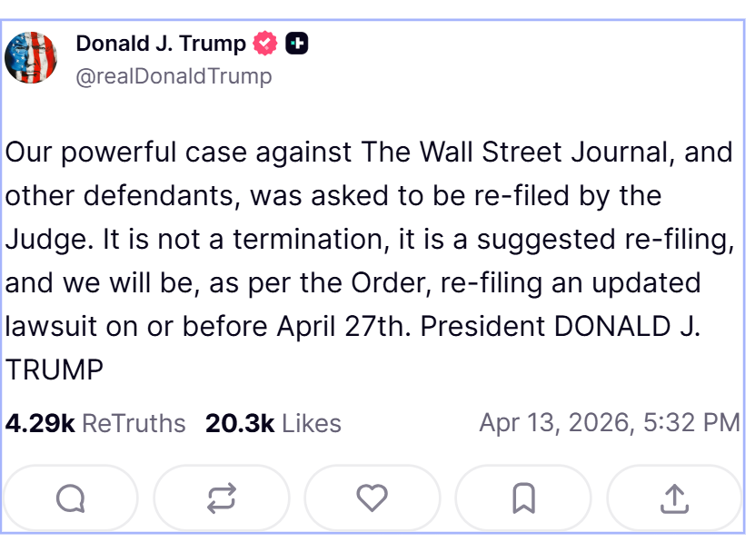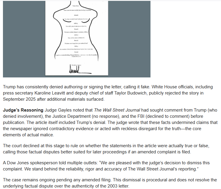 [070]Federal Judge Dismisses Trump's Defamation Lawsuit Against The Wall Street Journal Over Epstein Birthday Letter Report media link media link