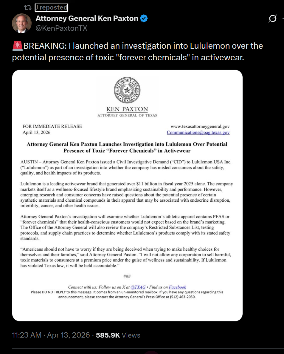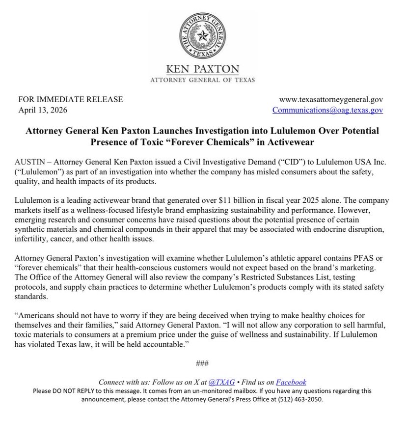 [013]TX Paxton: I launched an investigation into Lululemon over the potential presence of toxic "forever chemicals" in activewear media link media link