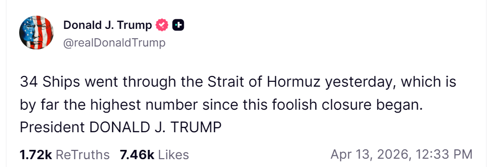 [003]@realDonaldTrump 34 Ships went through the Strait of Hormuz yesterday, which is by far the highest number since this foolish closure began. President DONALD J. TRUMP media link media link media link