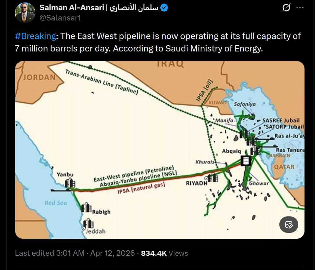 [010]The East West pipeline is now operating at its full capacity of 7 million barrels per day. According to Saudi Ministry of Energy media link media link