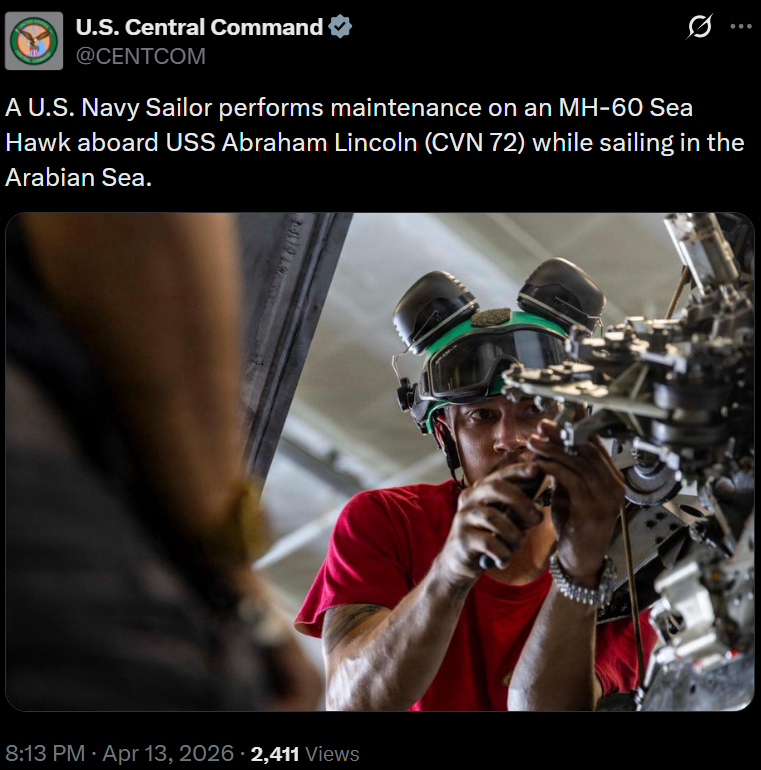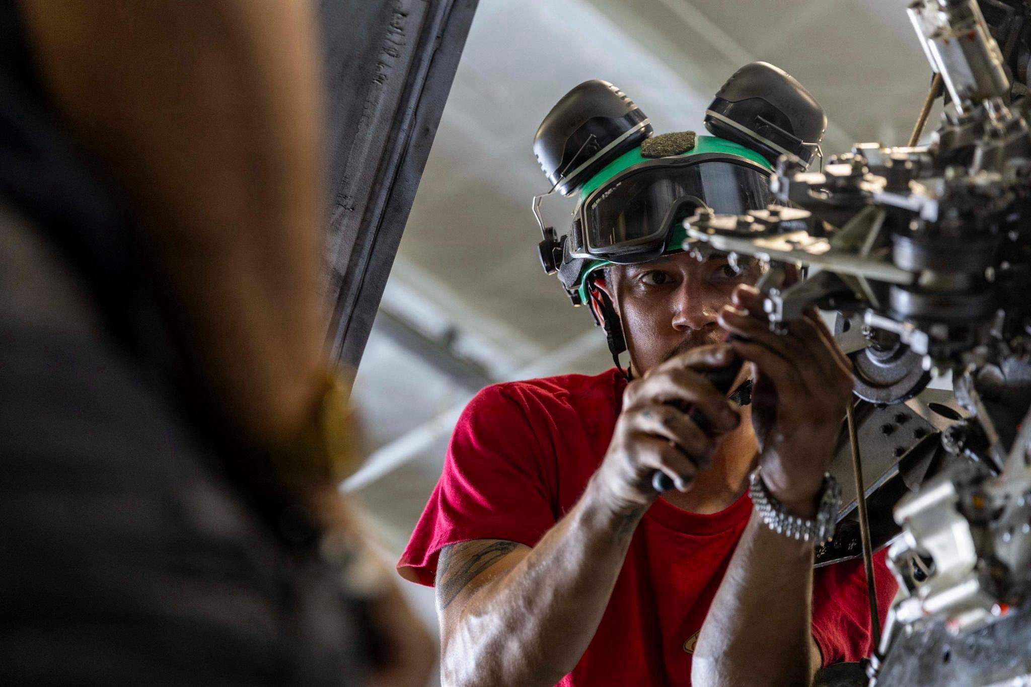 [069]@CENTCOM A U.S. Navy Sailor performs maintenance on an MH-60 Sea Hawk aboard USS Abraham Lincoln (CVN 72) while sailing in the Arabian Sea media link media link