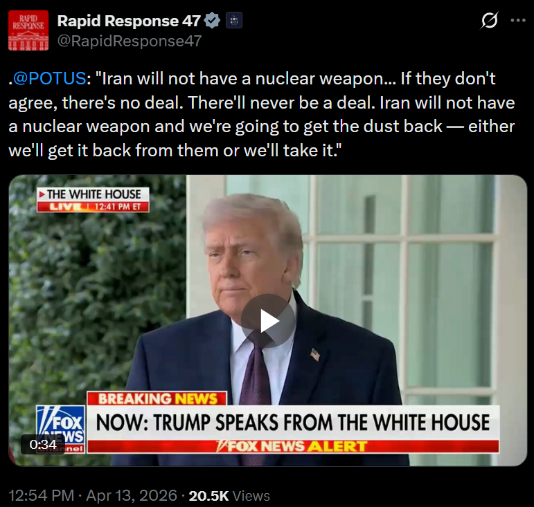 [011]@POTUS: "Iran will not have a nuclear weapon… If they don't agree, there's no deal. There'll never be a deal. Iran will not have a nuclear weapon and we're going to get the dust back — either we'll get it back from them or we'll take it." media link media link