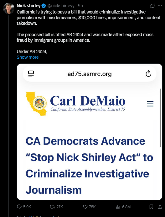 [066]California is trying to pass a bill that would criminalize investigative journalism with misdemeanors, $10,000 fines, imprisonment, and content takedown media link media link media link