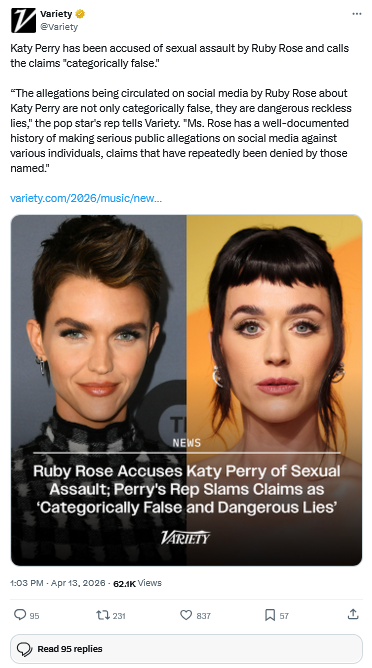 [051]Katy Perry has been accused of sexual assault by Ruby Rose and calls the claims "categorically false." media link