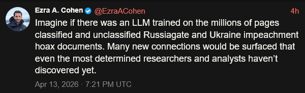 [068]ECW: Imagine if there was an LLM trained on the millions of pages classified and unclassified Russiagate and Ukraine impeachment hoax documents. Many new connections would be surfaced that even the most determined researchers and analysts haven’t discovered yet media link