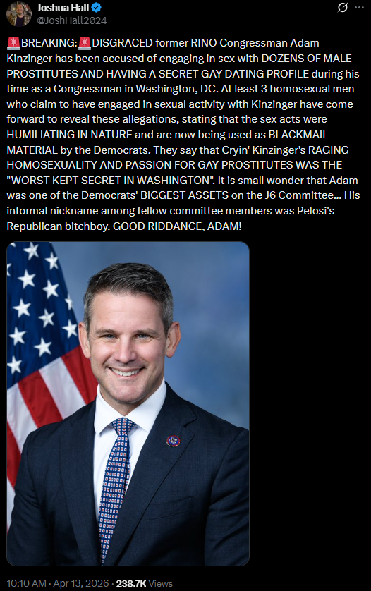 [058]DISGRACED former RINO Congressman Adam Kinzinger has been accused of engaging in sex with DOZENS OF MALE PROSTITUTES AND HAVING A SECRET GAY DATING PROFILE during his time as a Congressman in Washington, DC media link