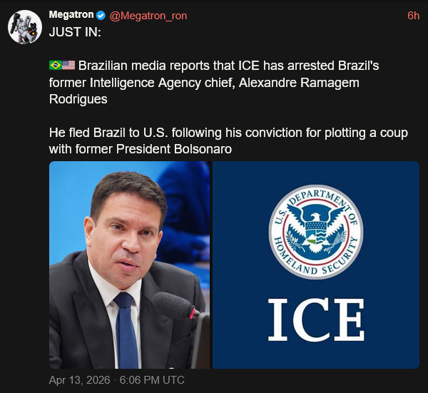 [071]🇧🇷🇺🇸 Brazilian media reports that ICE has arrested Brazil's former Intelligence Agency chief, Alexandre Ramagem Rodrigues media link media link