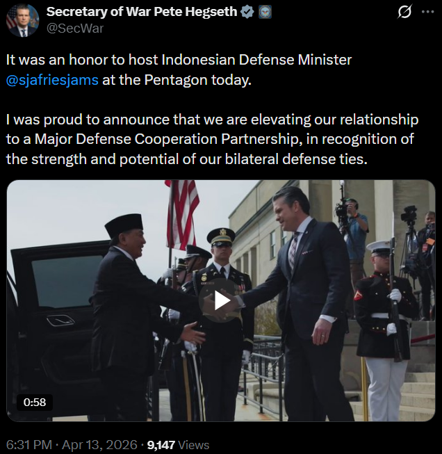 [060]@SecWar: It was an honor to host Indonesian Defense Minister @sjafriesjams at the Pentagon today media link media link
