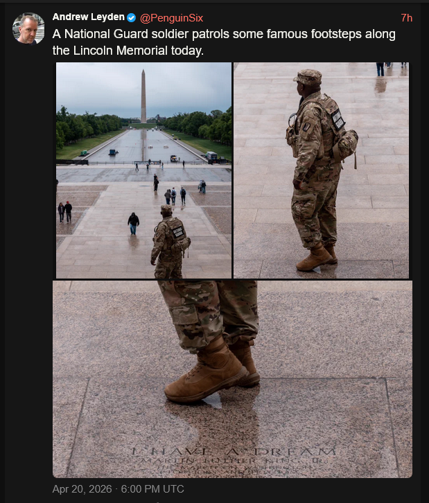 [092]@PenguinSix A National Guard soldier patrols some famous footsteps along the Lincoln Memorial today media link