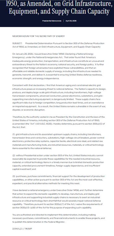 [026]Presidential Determination Pursuant to Section 303 of the Defense Production Act of 1950, as Amended, on Grid Infrastructure, Equipment, and Supply Chain Capacity media link