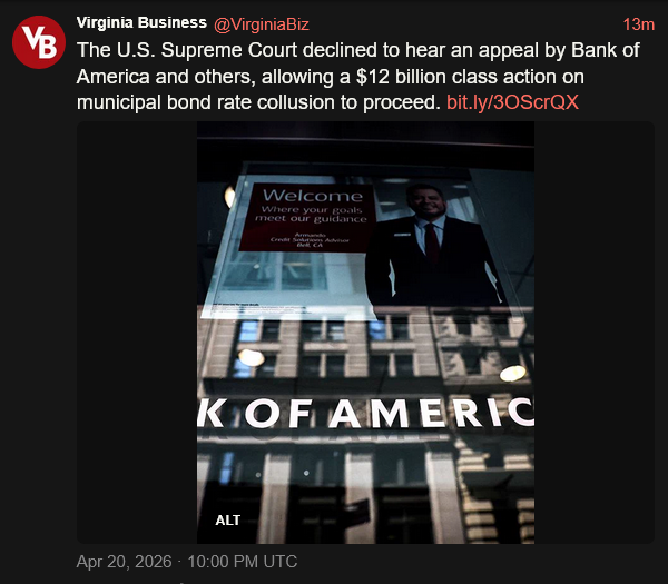 [045]US Supreme Court rebuffs BoA and other bank's challenge to class-action status of bank collusion suit media link