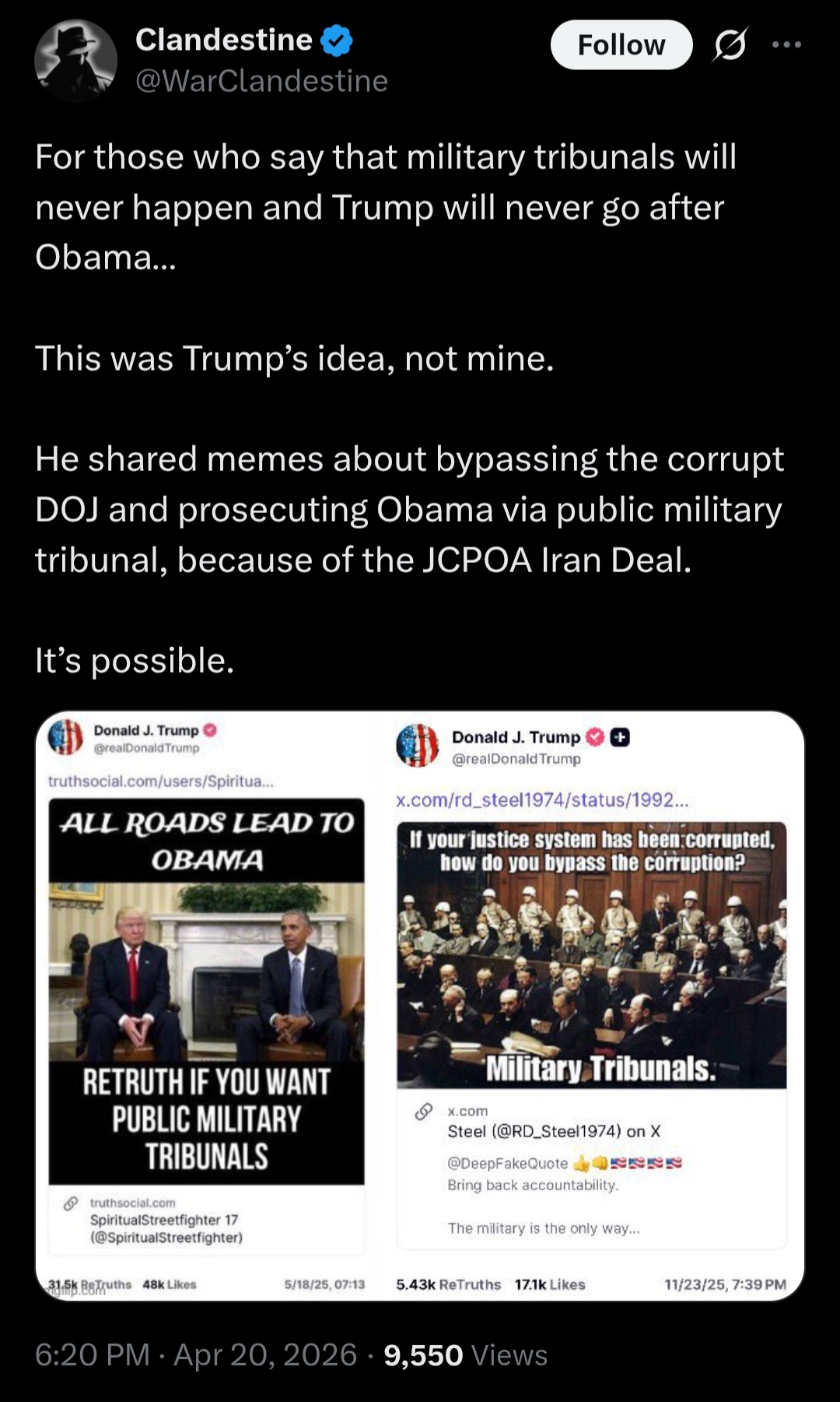 [058]Trump shared memes about bypassing the corrupt DOJ and prosecuting Obama via public military tribunal... jus sayin' media link