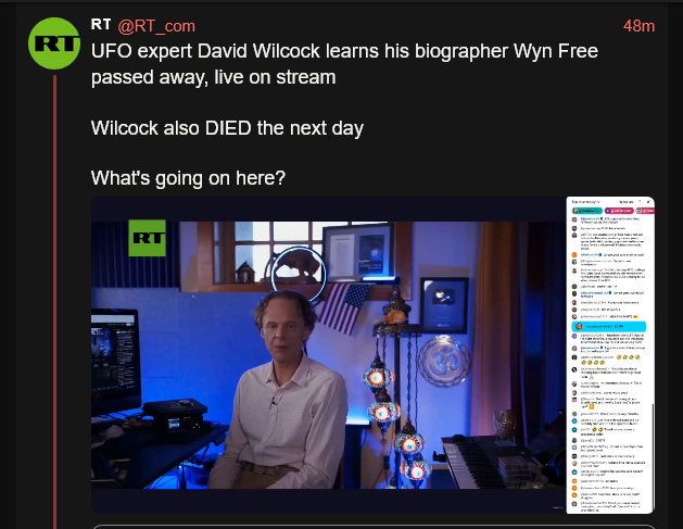 [051]UFO expert David Wilcock learns his biographer Wyn Free passed away, live on stream. Next day, he’s dead. What’s going on? media link media link media link