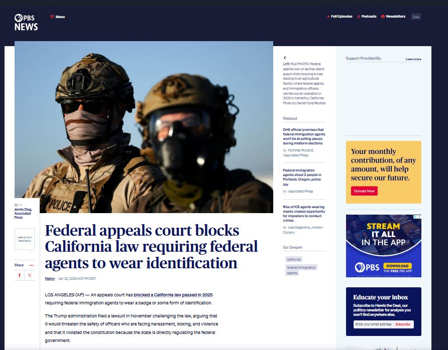 [008]Federal appeals court blocks California law requiring federal agents to wear identification media link