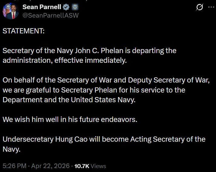 [015]Secretary of the Navy John C. Phelan is departing, Undersecretary Hung Cao will become Acting Secretary of the Navy media link