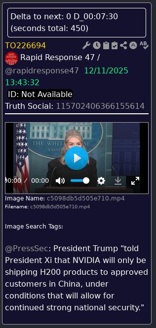[072]@PressSec: President Trump "told President Xi that NVIDIA will only be shipping H200 products to approved customers in China media link