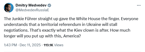 [108]@MedvedevRussiaE The Junkie Führer straight up gave the White House the finger. Everyone understands that a territorial referendum in Ukraine will stall negotiations. That's exactly what the Kiev clown is after. How much longer will you put up with this, America?