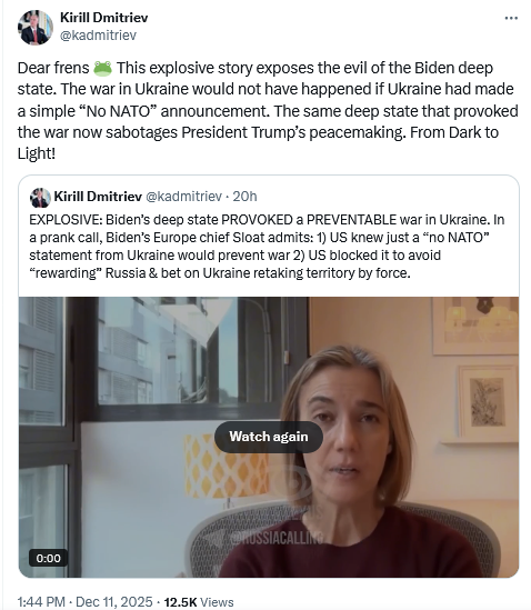 [106]ICYMI: Dear frens 🐸 This explosive story exposes the evil of the Biden deep state. The war in Ukraine would not have happened if Ukraine had made a simple “No NATO” announcement. The same DS that provoked the war now sabotages President Trump’s peacemaking. From Dark to Light!
