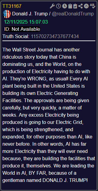 [080]@realDonaldTrump The Wall Street Journal has another ridiculous story today that China is dominating us, and the World, on the production of Electricity having to do with AI. They’re WRONG, as usual!