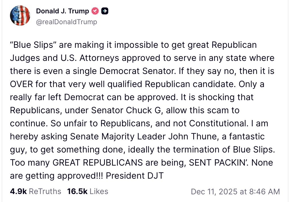 [022]@realDonaldTrump “Blue Slips” are making it impossible to get great Republican Judges and U.S. Attorneys approved to serve in any state where there is even a single Democrat Senator