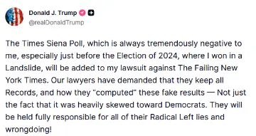 [010]@realDonaldTrump The Times Siena Poll, which is always tremendously negative to me, especially just before the Election of 2024, where I won in a Landslide, will be added to my lawsuit against The Failing New York Times. Our lawyers have demanded that they keep all Records, and how they “computed” these fake results — Not just the fact that it was heavily skewed toward Democrats. They will be held fully responsible for all of their Radical Left lies and wrongdoing!