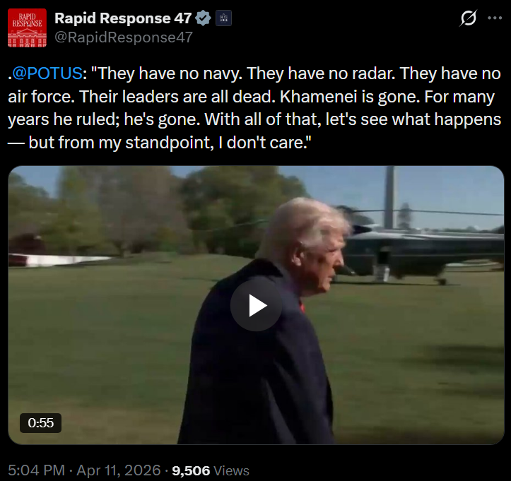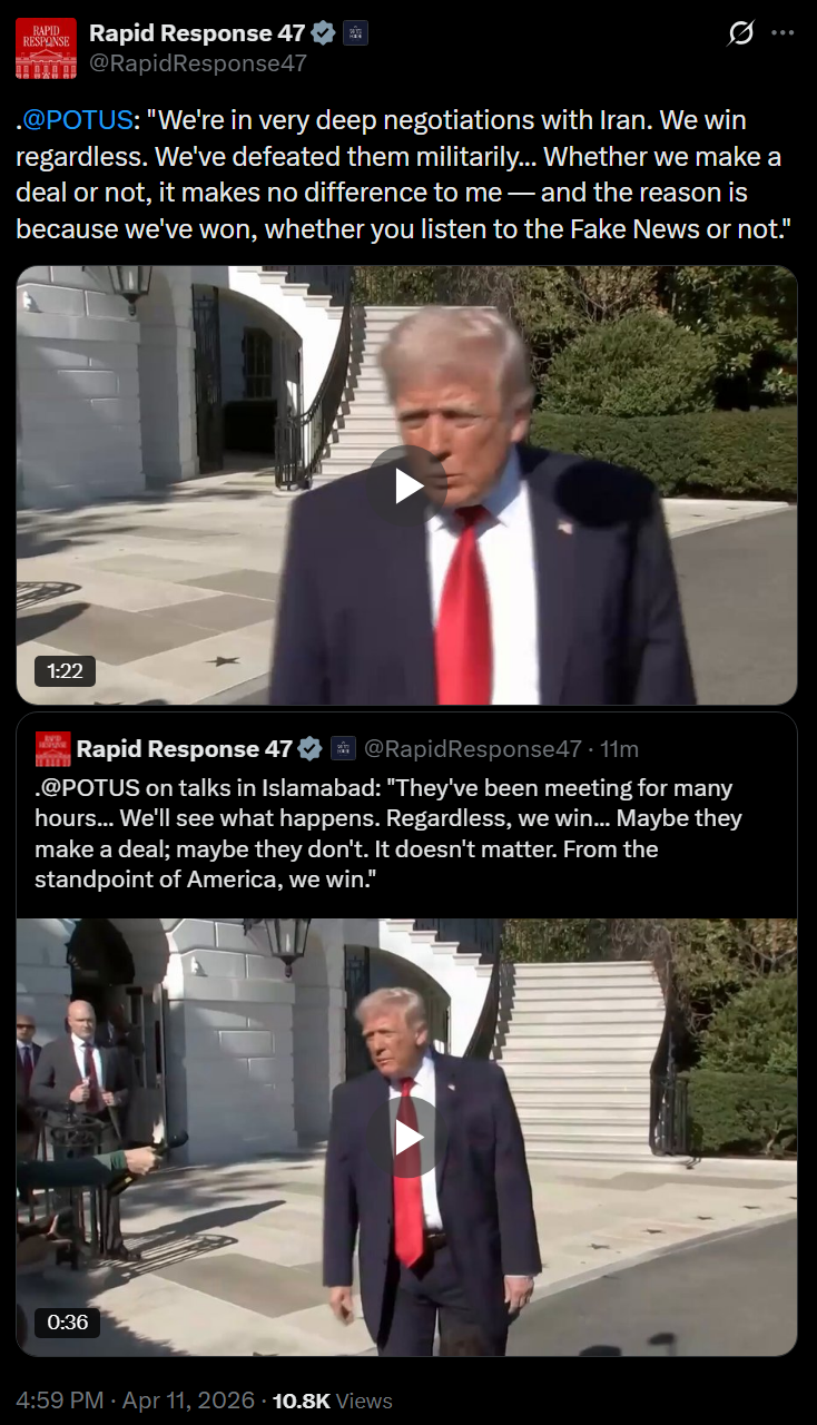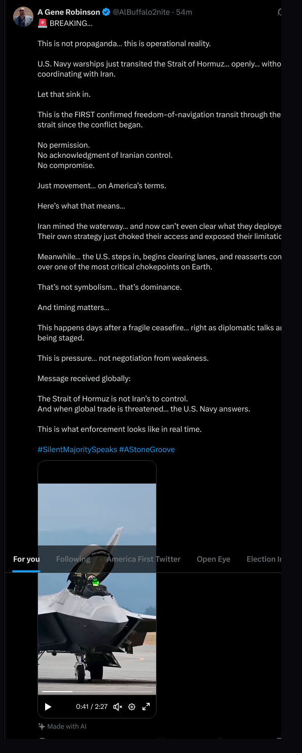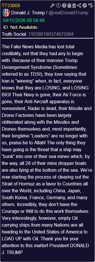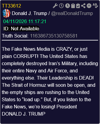 [028]@realDonaldTrump The Fake News Media is CRAZY, or just plain CORRUPT! The United States has completely destroyed Iran’s Military, including their entire Navy and Air Force, and everything else. Their Leadership is DEAD! The Strait of Hormuz will soon be open, and the empty ships are rushing to the United States to “load up.” But, if you listen to the Fake News, we’re losing! President DONALD J. TRUMP