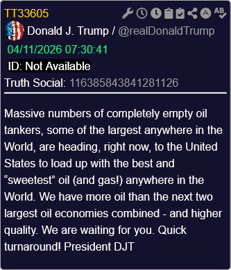 [009]@realDonaldTrump Massive numbers of completely empty oil tankers, some of the largest anywhere in the World, are heading, right now, to the United States to load up with the best and “sweetest” oil (and gas!) anywhere in the World. We have more oil than the next two largest oil economies combined - and higher quality. We are waiting for you. Quick turnaround! President DJT