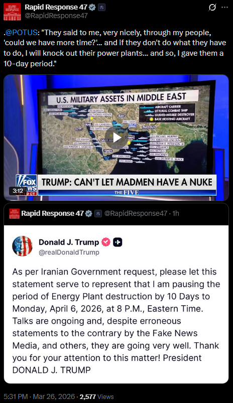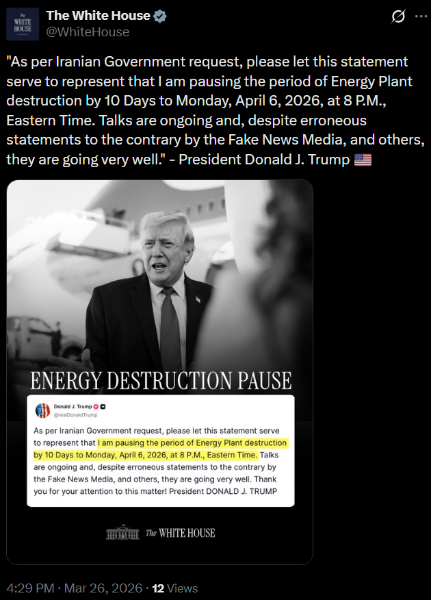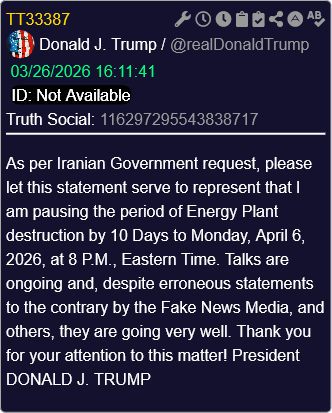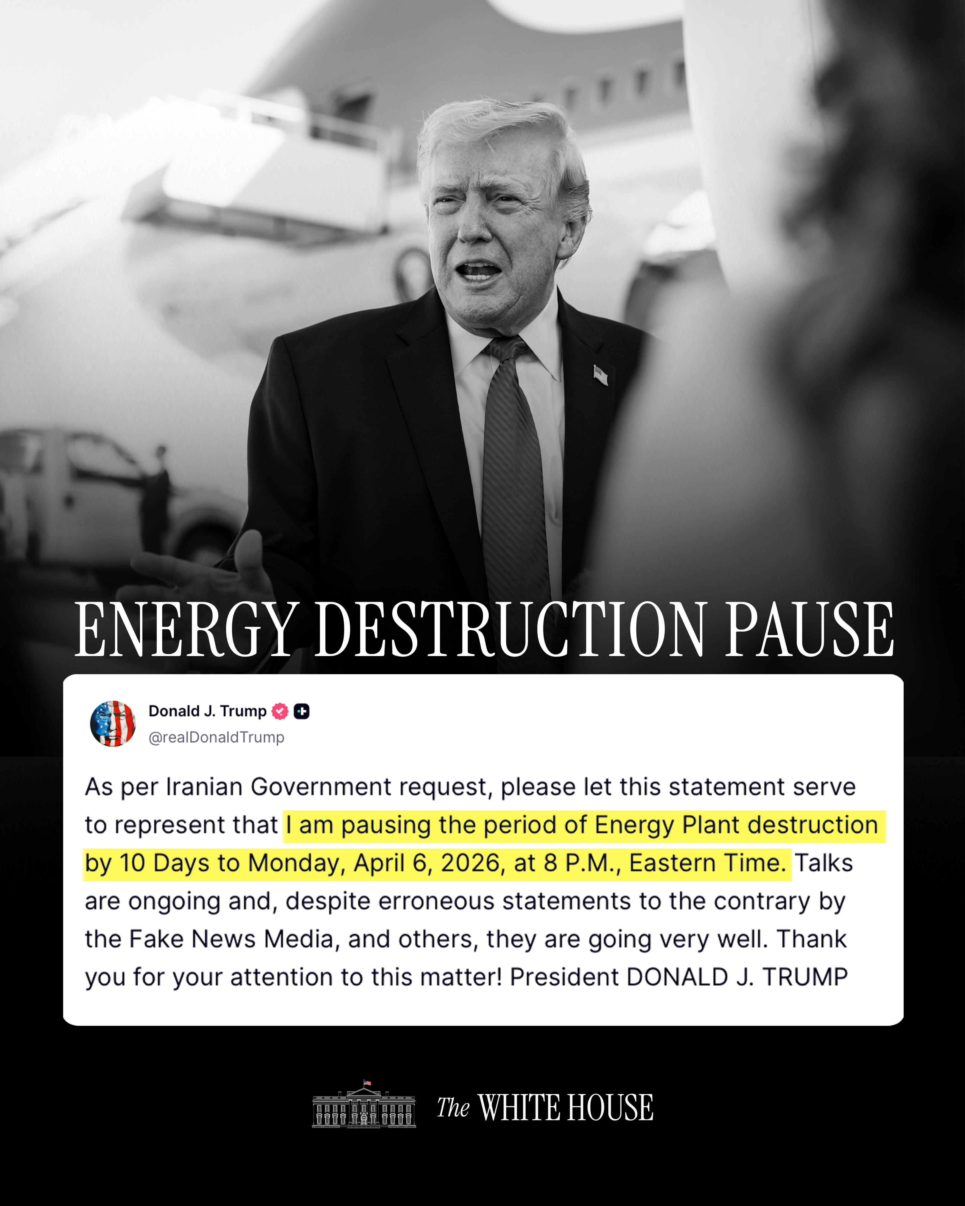 [049]@realDonaldTrump As per Iranian Government request, please let this statement serve to represent that I am pausing the period of Energy Plant destruction by 10 Days to Monday, April 6, 2026, at 8 P.M media link media link media link media link