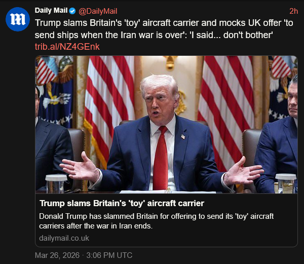 [016]Trump slams Britain's 'toy' aircraft carrier and mocks UK offer 'to send ships when the Iran war is over' media link
