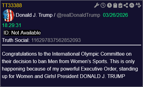 [072]@realDonaldTrump Congratulations to the International Olympic Committee on their decision to ban Men from Women’s Sports media link