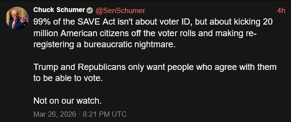 [096]@SenSchumer 99% of the SAVE Act isn't about voter ID, but about kicking 20 million American citizens off the voter rolls and making re-registering a bureaucratic nightmare media link