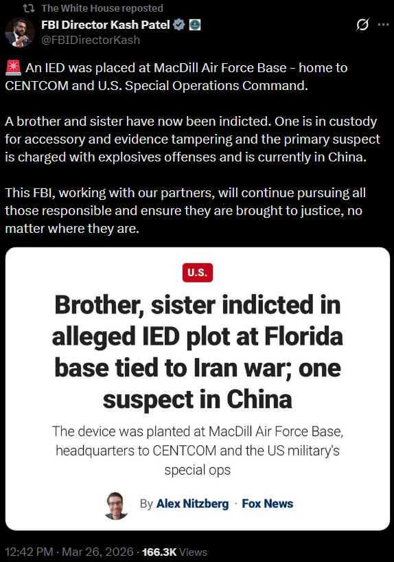 [015]🚨 An IED was placed at MacDill Air Force Base - home to CENTCOM and U.S. Special Operations Command. 2 indicted media link media link