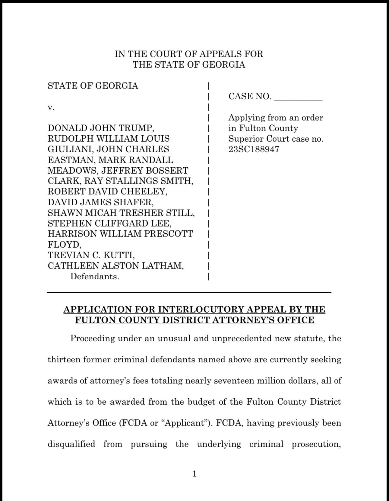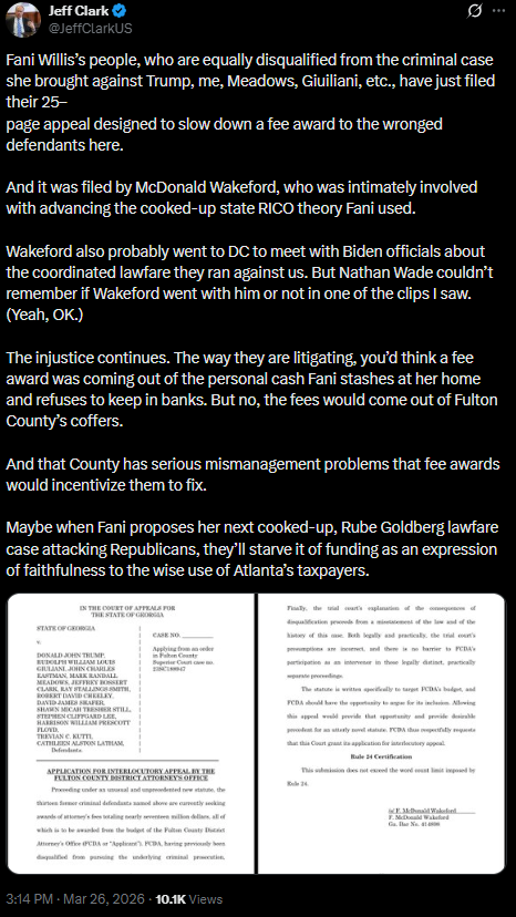 [077]Fani Willis’s people, who are equally disqualified from the criminal case she brought against Trump, me, Meadows, Giuiliani, etc., have just filed their 25– page appeal designed to slow down a fee award to the wronged defendants here media link media link media link